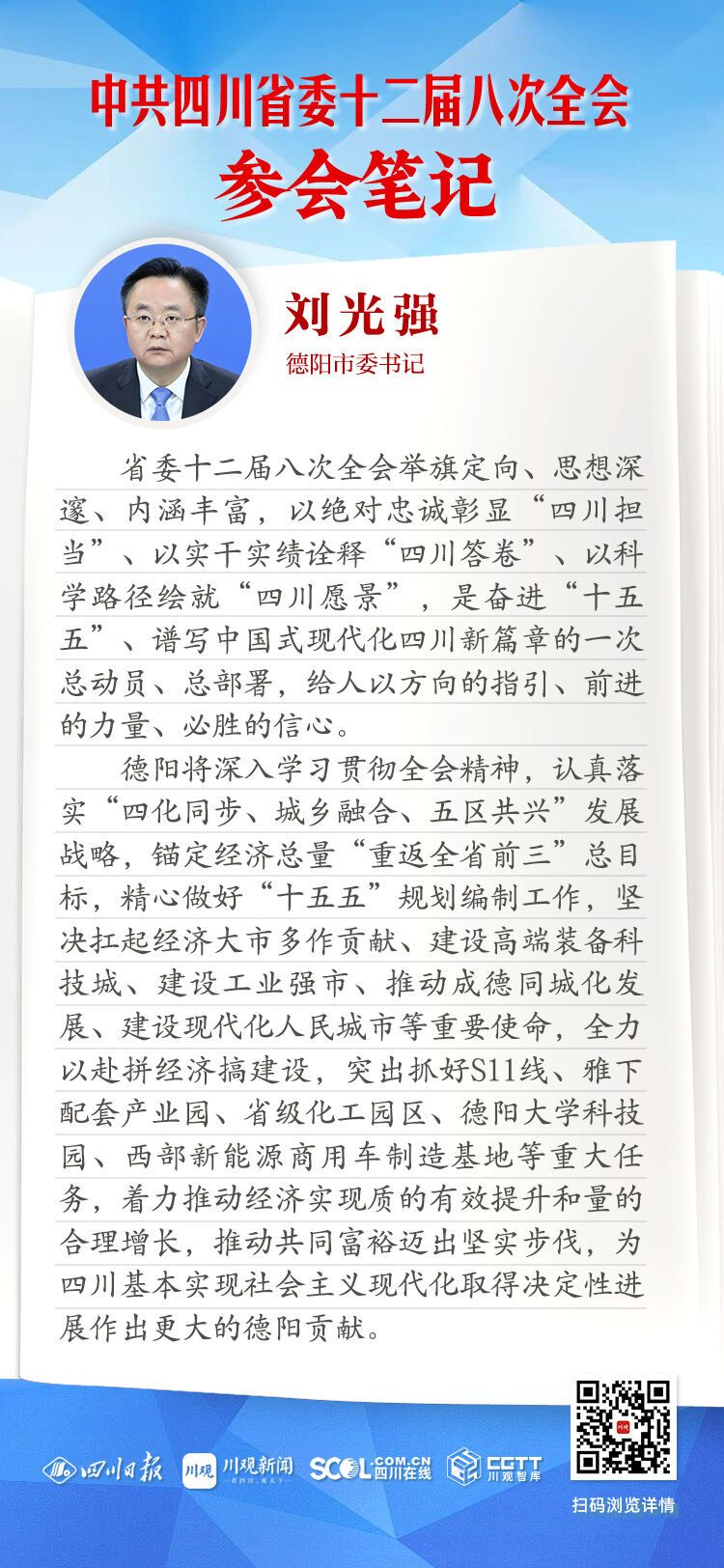 德阳将深入学习贯彻全会精神,认真落实“四化同步、城乡融合、五区共兴”发展战略,锚定经济总量“重返全省前三”总目标,精心做好“十五五”规划编制工作,坚决扛起经济大市多作贡献、建设高端装备科技城、建设工业强市、推动成德同城化发展、建设现代化人民城市等重要使命,全力以赴拼经济搞建设,突出抓好S11线、雅下配套产业园、省级化工园区、德阳大学科技园、西部新能源商用车制造基地等重大任务,着力推动经济实现质的有效提升和量的合理增长,推动共同富裕迈出坚实步伐,为四川基本实现社会主义现代化取得决定性进展作出更大的德阳贡献。