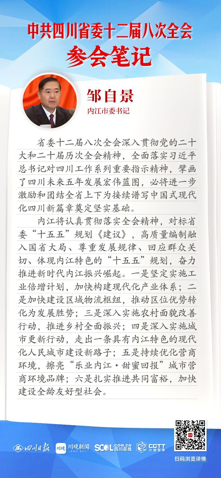 内江将认真贯彻落实全会精神,对标省委“十五五”规划《建议》,高质量编制融入国省大局、尊重发展规律、回应群众关切、体现内江特色的“十五五”规划,奋力推进新时代内江振兴崛起。一是坚定实施工业倍增计划,加快构建现代化产业体系;二是加快建设区域物流枢纽,推动区位优势转化为发展胜势;三是深入实施农村面貌改善行动,推进乡村全面振兴;四是深入实施城市更新行动,走出一条具有内江特色的现代化人民城市建设新路子;五是持续优化营商环境,擦亮“乐业内江·甜蜜回报”城市营商环境品牌;六是扎实推进共同富裕,加快建设全龄友好型社会。