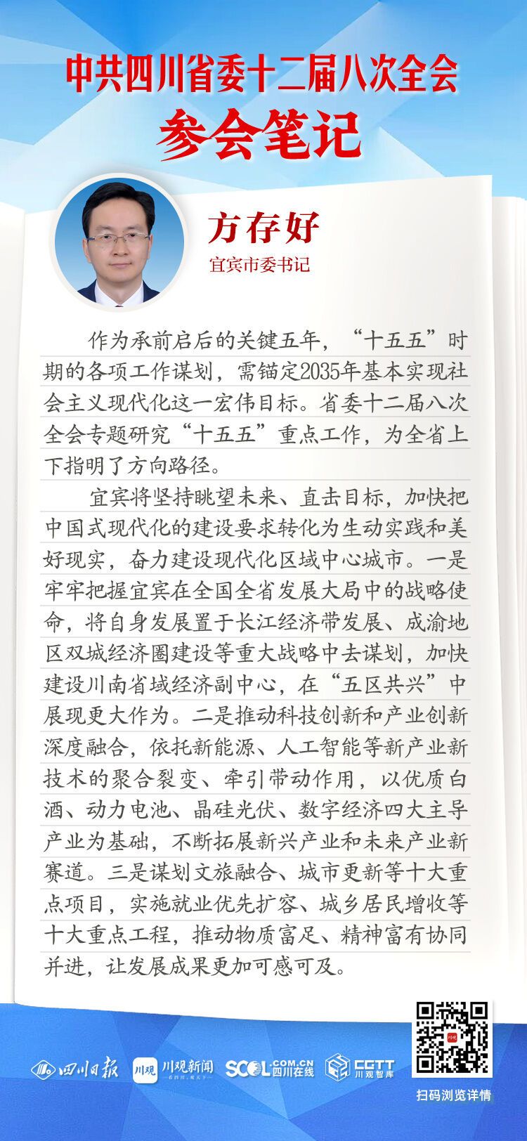 宜宾将坚持眺望未来、直击目标,加快把中国式现代化的建设要求转化为生动实践和美好现实,奋力建设现代化区域中心城市。一是牢牢把握宜宾在全国全省发展大局中的战略使命,将自身发展置于长江经济带发展、成渝地区双城经济圈建设等重大战略中去谋划,加快建设川南省域经济副中心,在“五区共兴”中展现更大作为。二是推动科技创新和产业创新深度融合,依托新能源、人工智能等新产业新技术的聚合裂变、牵引带动作用,以优质白酒、动力电池、晶硅光伏、数字经济四大主导产业为基础,不断拓展新兴产业和未来产业新赛道。三是谋划文旅融合、城市更新等十大重点项目,实施就业优先扩容、城乡居民增收等十大重点工程,推动物质富足、精神富有协同并进,让发展成果更加可感可及。