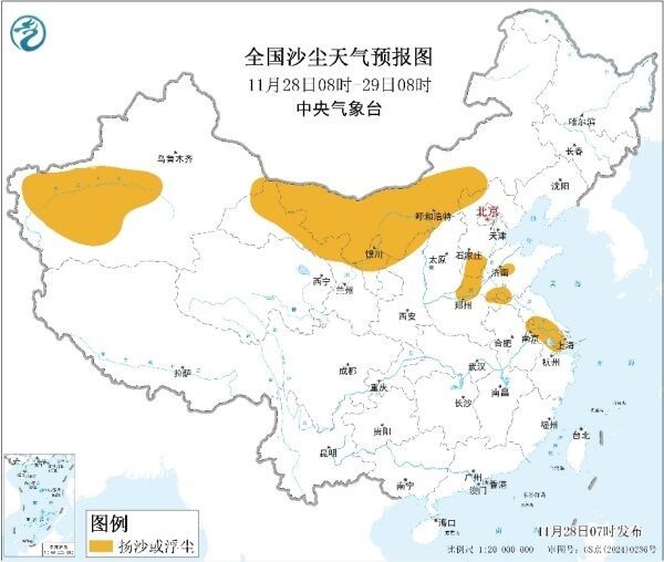 受冷空气活动影响,预计今天夜间至11月30日,内蒙古中西部、甘肃河西地区、宁夏、陕西中北部、华北北部等地的部分地区有扬沙或浮尘天气。