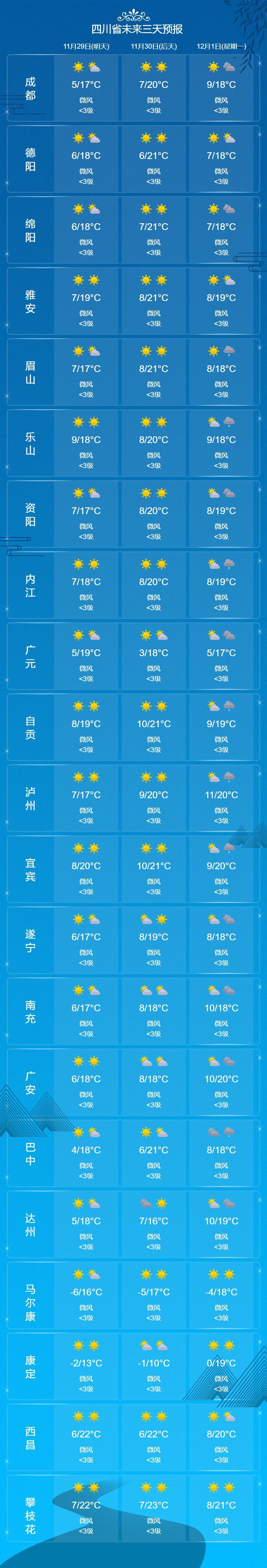 顺便说一句,虽然已到11月底,但四川盆地还没入冬。各位,请珍惜深秋的阳光吧!可靠消息,12月初——下周,四川将迎来一次降温降水天气过程。
