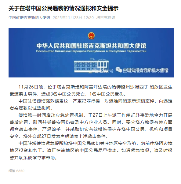 ·塔吉克斯坦和阿富汗边境发生武装袭击致中国公民3死1伤,中使馆发提醒。