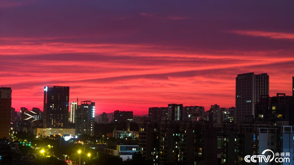 11月27日,广东珠海,受台风“天琴”外围云系影响,城市上空红霞绮丽。