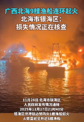 ·9艘渔船连环起火,广西北海市银海区政府通报:损失情况正在核查。