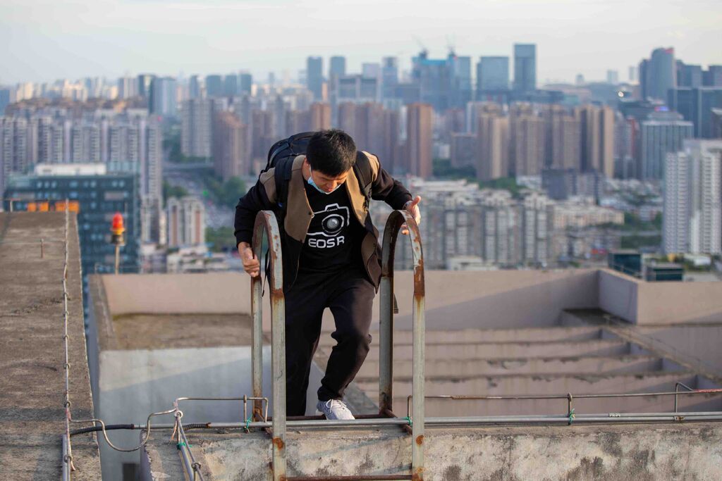 此后,他如勇敢探险家,穿梭于成都高楼间,不惧艰难与狂风,只为寻找独特机位。每座高楼都是新挑战与创作天地,他背着沉重设备攀登,汗水湿透衣衫,眼神却始终坚定。