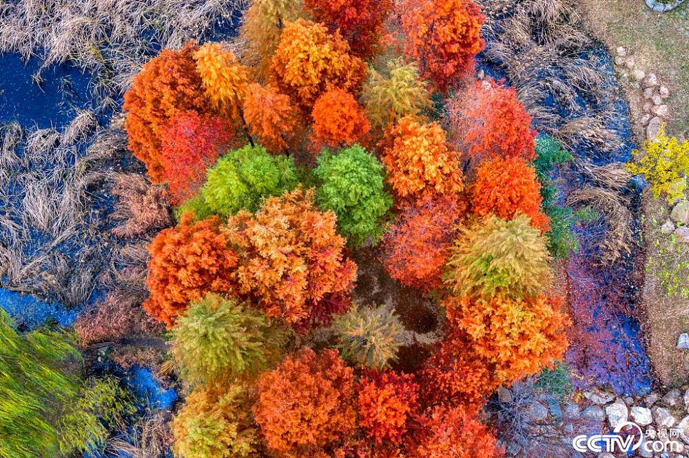 11月30日,山东省青岛市西海岸新区唐岛湾湿地冬韵漫染,林地中彩叶斑斓,绚丽色块交织错落,冬季的诗情画意尽情绵延。