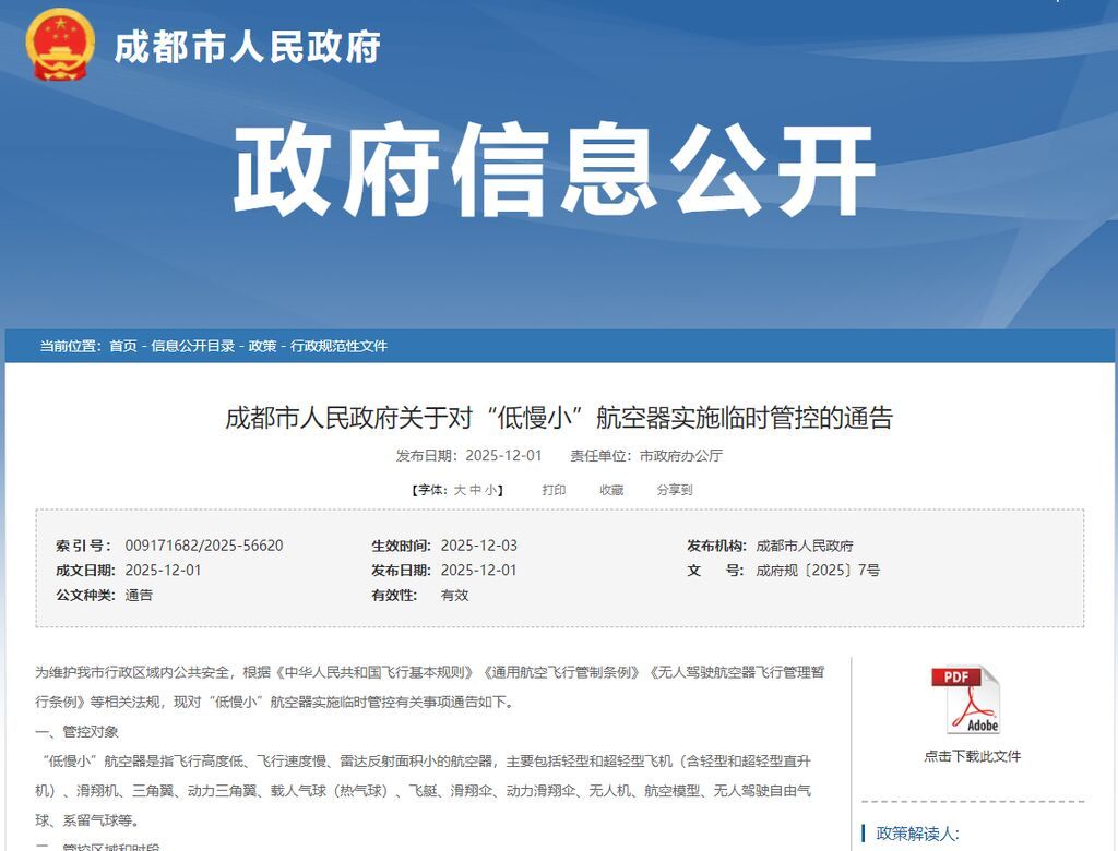 日前,成都市人民政府发布最新通告,对“低慢小”航空器实施临时管控。全文如下: