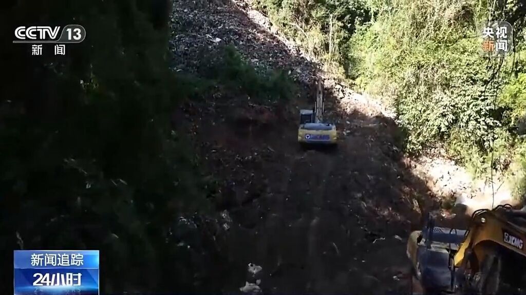 总台央视记者 陈允涛:在山谷的谷底,从这儿可以更清楚地看到剖面,我们发现比想象中的更陡峭,将近有80度左右。我面前的这些垃圾经过十几年左右的堆放,一些垃圾已经开始分解,现场也能闻到刺鼻的味道。挖掘机遇到了一个新的问题,在施工的过程中发现有块巨石有松动的风险。施工人员准备上去安装雷管,爆破之后再进行作业。