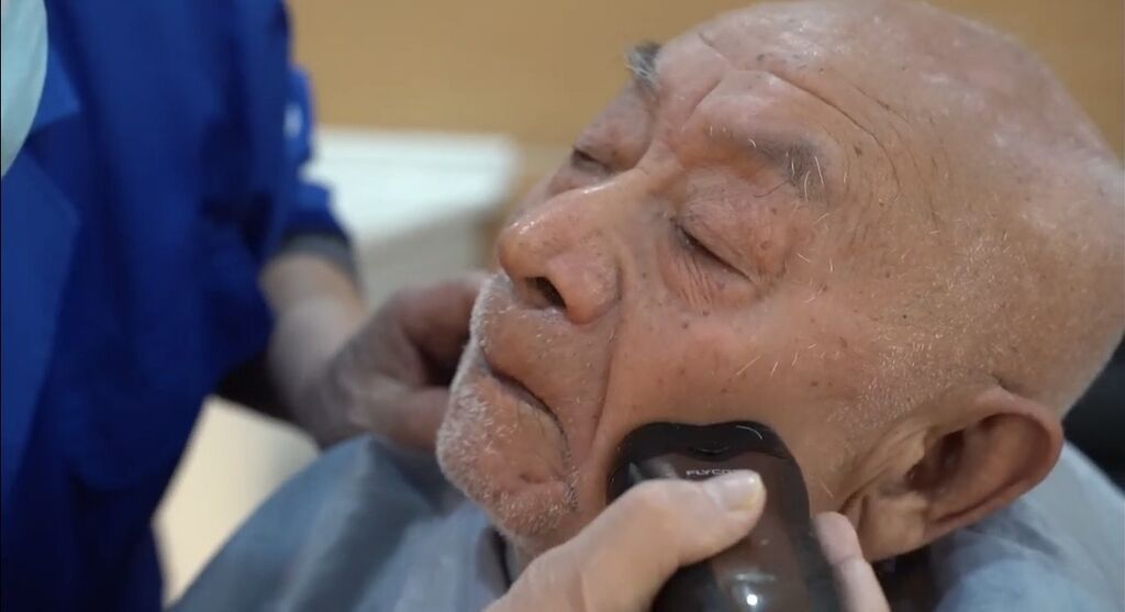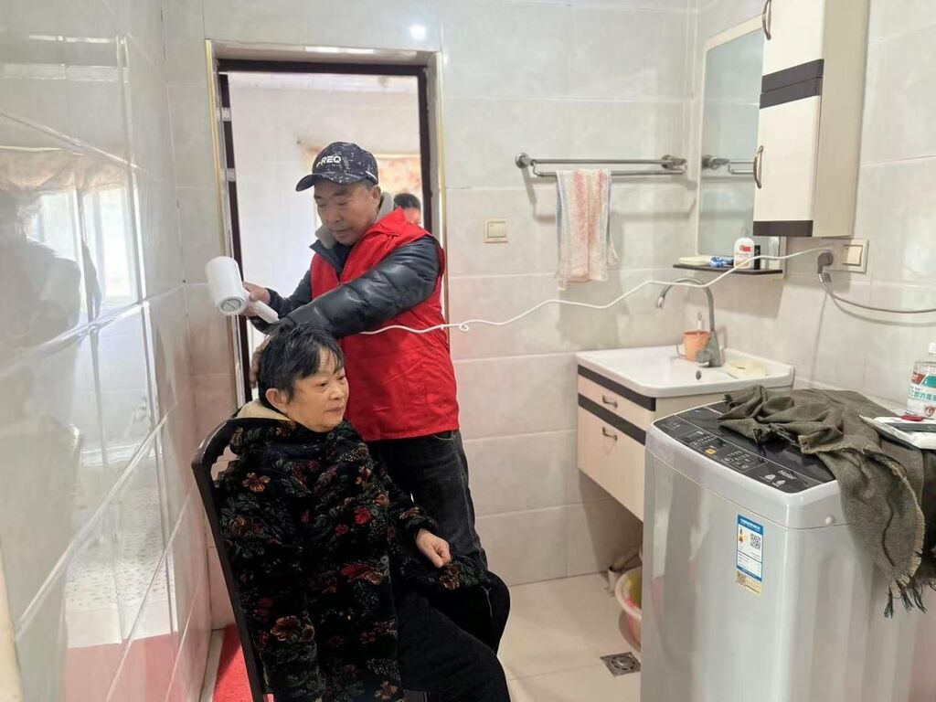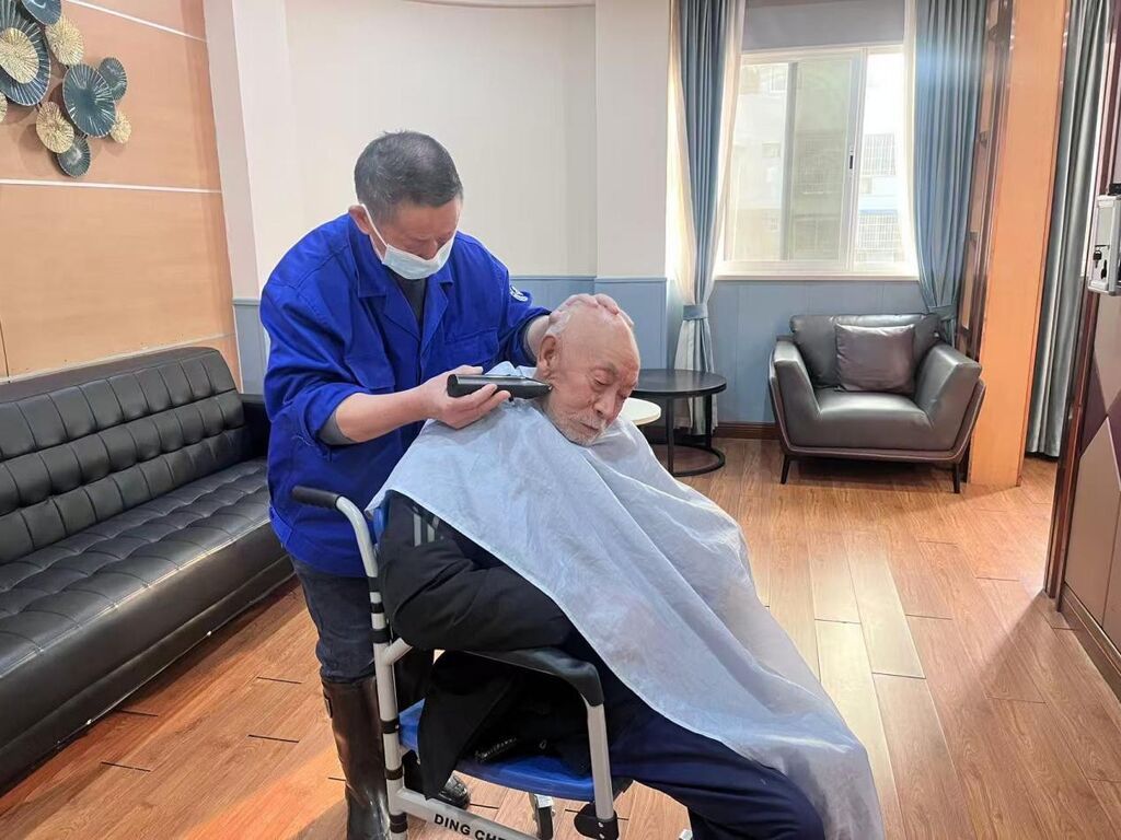 洗完澡后,服务还在继续。助浴员告诉记者,除了洗浴服务,他们还会针对老人需求,额外提供理发、修剪指甲等延伸服务。说着,他给曾大爷围好干净围布,手持电动工具轻柔操作起来,最后还细心清理掉在脖颈处的碎发。