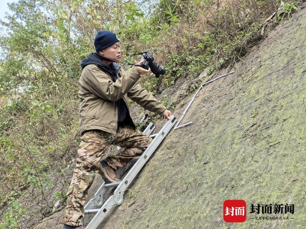 12月5日下午,研究人员们手持毛刷小心翼翼清理浮土、拍照、测量、绘制地层剖面图,对足迹化石进行三维扫描,完成了初步的调查工作。“不远处还有三个连续的足迹组成一道行迹,最下方的一枚连爪痕末端都特别清晰。”邢立达说,经过初步调查,这处岩壁上总共发现了20多个大小不一的足迹。