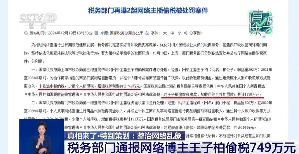 2024年5月,国家税务总局上海市税务局第三稽查局发现,王子柏申报收入与其直播带货销量严重不匹配,后查实其偷税749万元,最终被追缴税费、加收滞纳金并处罚款共计1330万元。