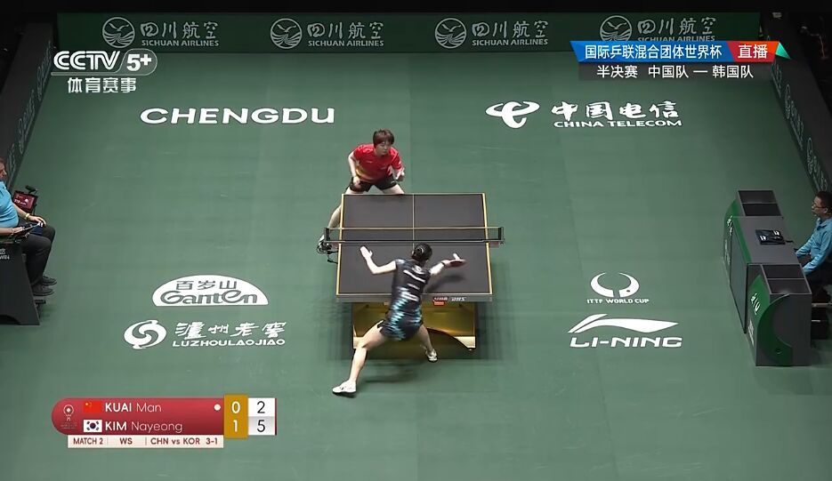 第四场女双比赛,蒯曼/王曼昱1-1战平李恩惠/崔孝珠,两局比分为:5-11、14-12。最终,中国队大比分8-3击败韩国队。