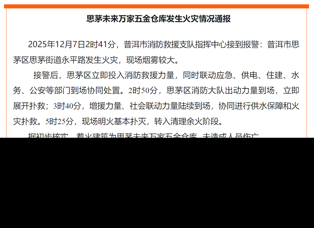 据初步核实,着火建筑为思茅未来万家五金仓库,未造成人员伤亡。目前,起火原因、直接财产损失等正在进一步调查核实中。