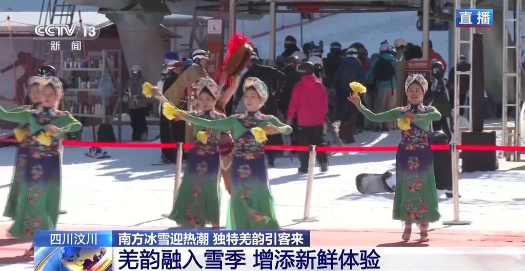 在羌人谷滑雪场,舞者们向游客展示羌族的传统舞蹈肩铃舞,肩部挂着一个手掌大小的铃铛,通过“甩肩、绕肩”等动作带动铃铛飞速旋转,发出清脆声响。工作人员介绍,每到客流高峰,雪场都会不定期地开展各类文化表演展示活动。