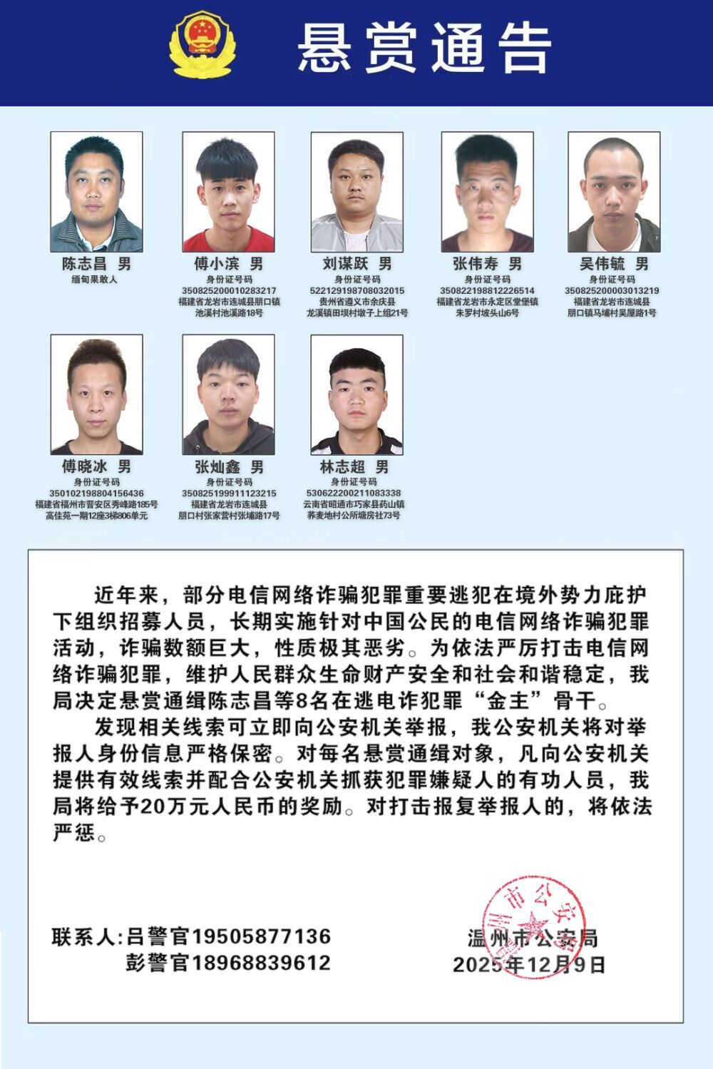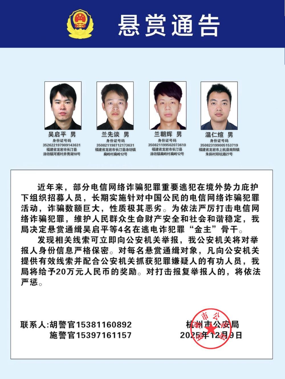 经查,近年来,吴启平、吴清正、傅小滨、欧长华等犯罪嫌疑人在境外势力庇护下,组织招募人员,长期实施针对中国公民的电信网络诈骗犯罪活动,诈骗数额巨大,性质极其恶劣。特别是公安部部署开展打击缅北涉我犯罪专项工作以来,在公安机关严打高压态势下,上述犯罪嫌疑人仍不收敛、不收手,继续大肆组织实施违法犯罪活动。该批在逃人员犯罪事实清楚、证据确凿充分,浙江杭州、温州,福建泉州、龙岩,河南平顶山,广东深圳,云南昆明和重庆等地公安机关决定对其进行公开悬赏通缉。