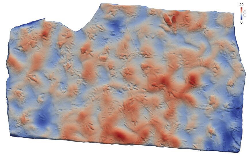 “这次研究最引人入胜的发现,在于对恐龙尾迹的精细分析。”江山说,研究人员采用高分辨率三维表面扫描和数字摄影测量技术,对石板表面的细微痕迹进行了毫米级精度的数字化建模。
