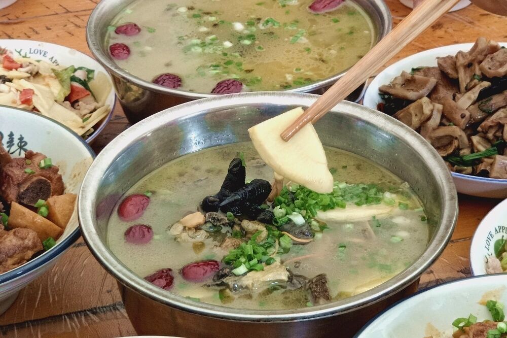 第一道:冬笋炖土鸡。农家散养跑山鸡剁块,柴火灶大铁锅内菜籽油烧热,姜片爆香,鸡块下锅猛火快炒至金黄。加入足量山泉水和厚切笋块,烈火转文火,砂锅盖沿冒出丝丝白气。一个半小时后开盖,金黄鸡油浮于汤面,笋块吸饱汤汁,脆嫩不改。