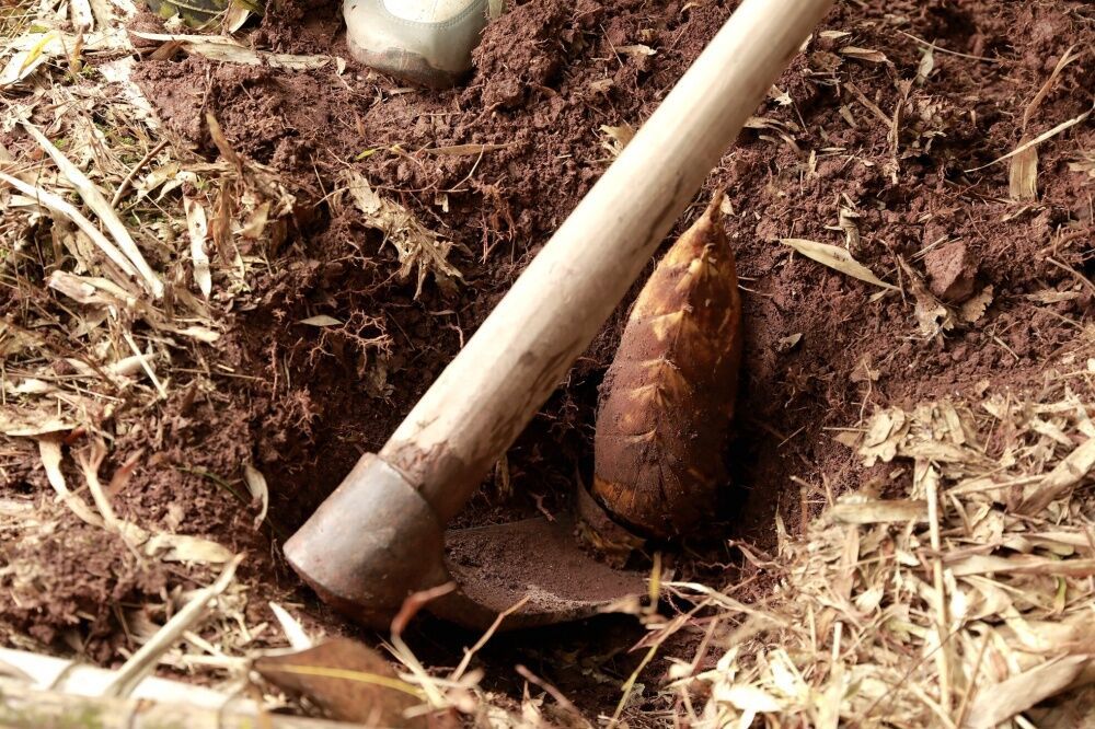 凭着多年挖笋的丰富经验,郭天琴不一会儿便选定一处微微龟裂的土面,用笋锄小心刨土,动作轻柔如考古发掘。几分钟后,一截黄色笋尖便显露了出来。