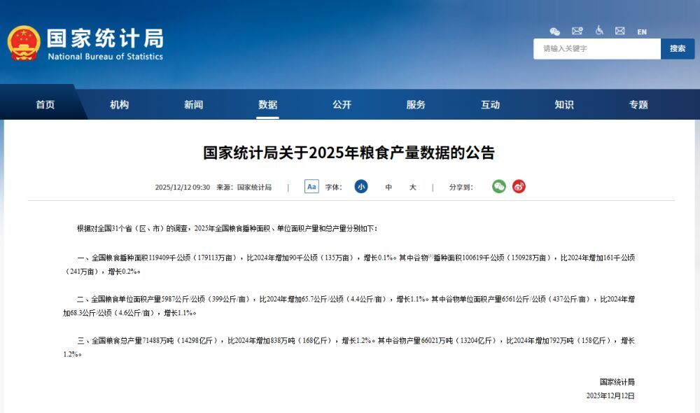 三、全国粮食总产量71488万吨(14298亿斤),比2024年增加838万吨(168亿斤),增长1.2%。其中谷物产量66021万吨(13204亿斤),比2024年增加792万吨(158亿斤),增长1.2%。