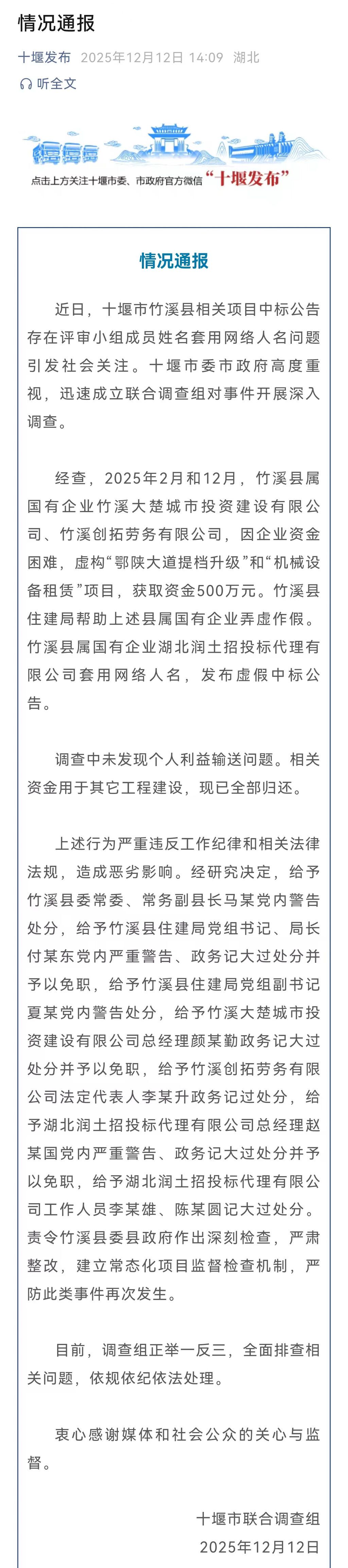 近日,十堰市竹溪县相关项目中标公告存在评审小组成员姓名套用网络人名问题引发社会关注。十堰市委市政府高度重视,迅速成立联合调查组对事件开展深入调查。