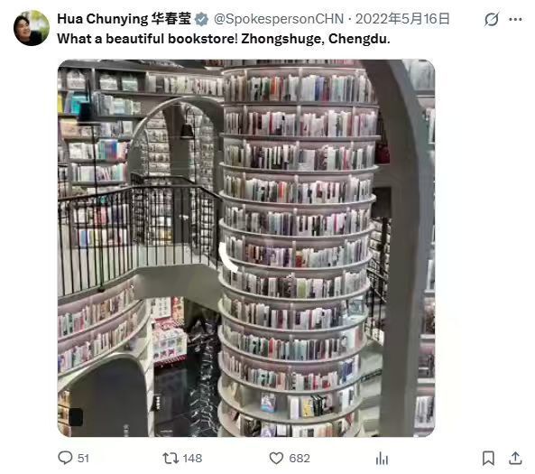 再把时钟拨回3年前,2022年,当时的发言人就在海外平台点赞了都江堰的钟书阁。这个网红书店,设计感直接拉满,拿奖拿到手软。