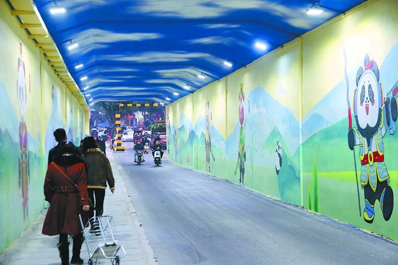 民有所呼,政有所应。作为顺庆区城市微更新重点工程,铁明路及铁路涵洞于2025年10月15日启动封闭改造,先由区住建局完成雨污分流埋管,再由区综合行政执法局市政所无缝衔接路面翻新与墙体美化,12月1日便正式恢复通行,仅用1个半月实现“痛点”变“亮点”。如今走进涵洞,破损路面已换成平整沥青路面,新增的排水系统彻底解决积水难题,单向增设的高亮度LED灯,让通行安全系数大幅提升。更令人眼前一亮的是墙体彩绘:西侧通道里,熊猫版诸葛亮手持羽扇、张飞挥舞丈八蛇矛,将三国文化与熊猫元素巧妙融合;东侧通道则绘上清晖阁、丝绸女神、万卷楼等南充地标。整个涵洞顶部铺满“蓝天白云”,仿佛将户外晴空“搬”进通道。