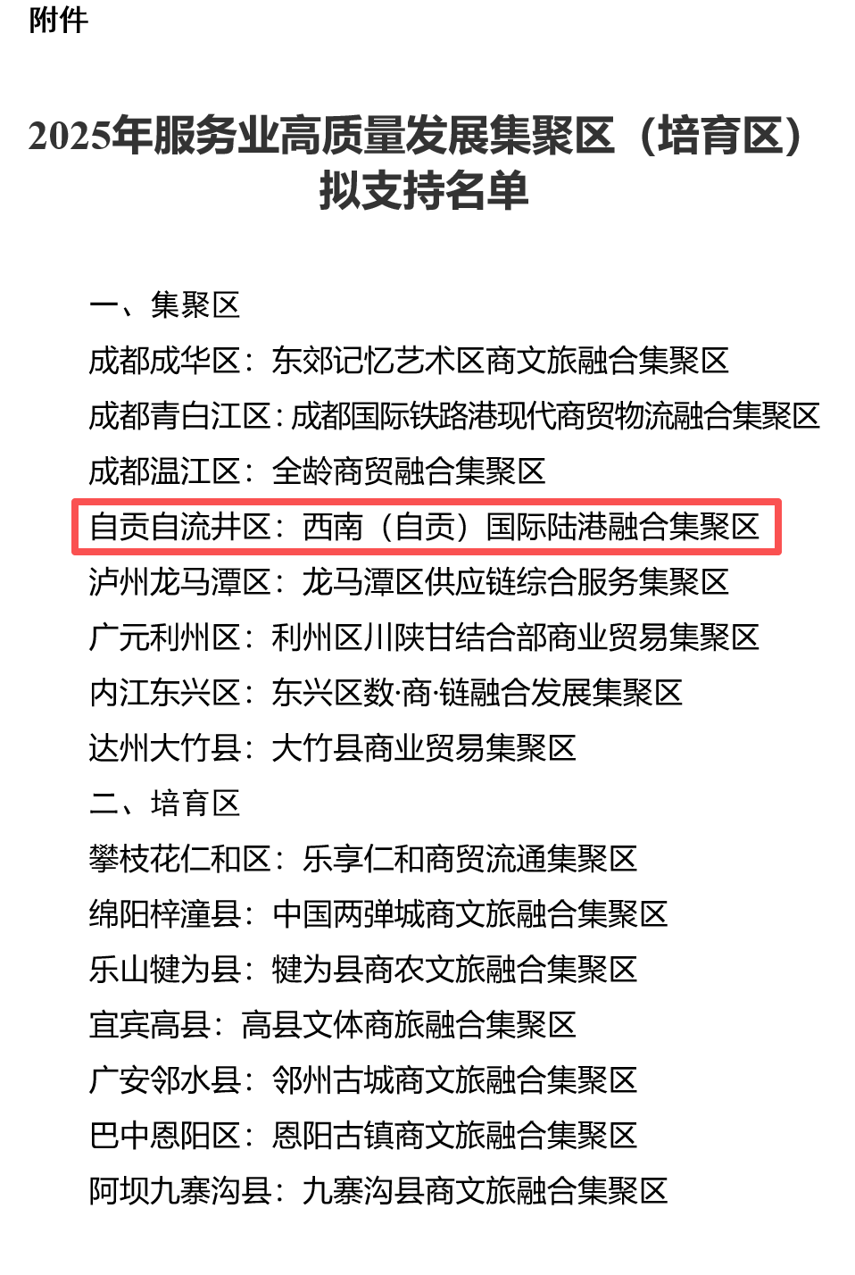 按照《四川省商务厅四川省财政厅关于开展2025年服务业高质量发展集聚区(培育区)申报工作的通知》要求,经各地自愿申报,日前,商务厅会同财政厅组织专家依据《2025年服务业高质量发展集聚区(培育区)评审方案》,确定了拟支持的2025年服务业高质量发展集聚区(培育区)名单。