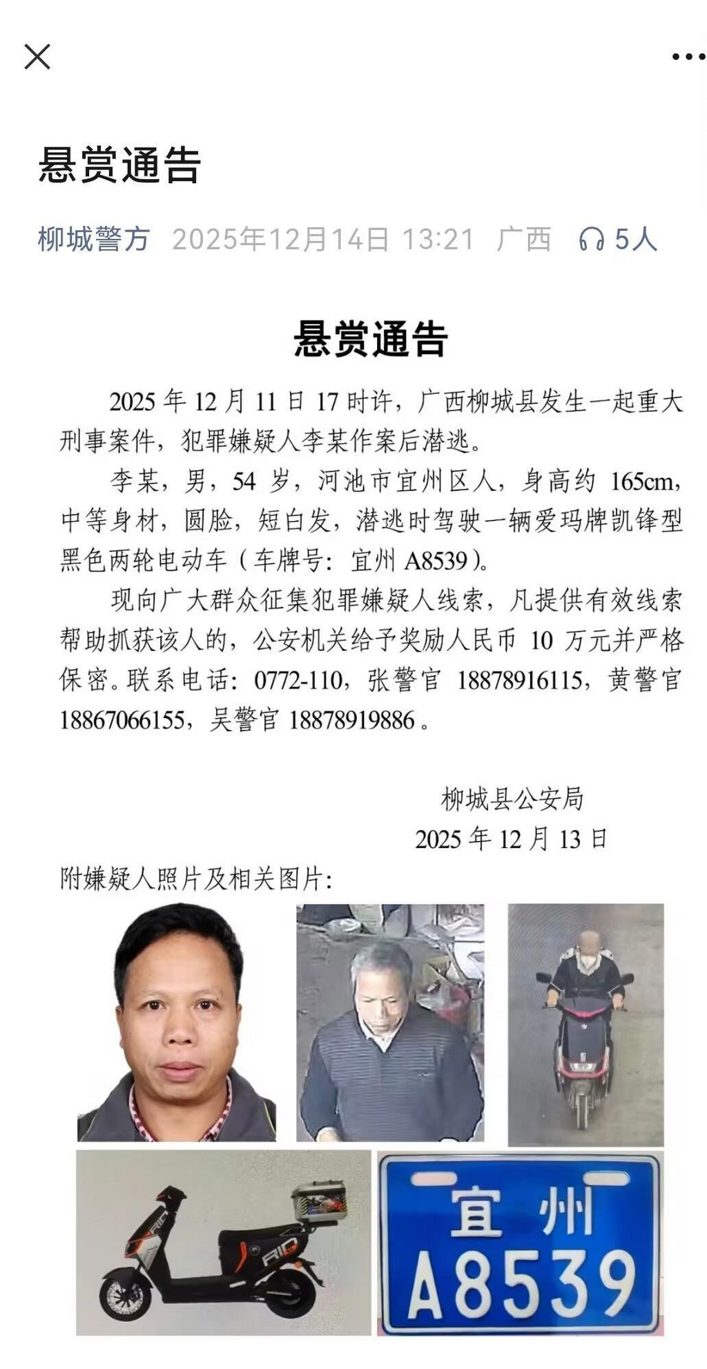 ·男子持刀行凶致两死后潜逃,广西柳城公安悬赏10万元征集线索。