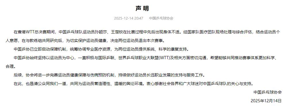 ·中国乒协回应WTT总决赛孙颖莎、王楚钦退赛:将进一步完善运动员健康保障与伤病预防机制。