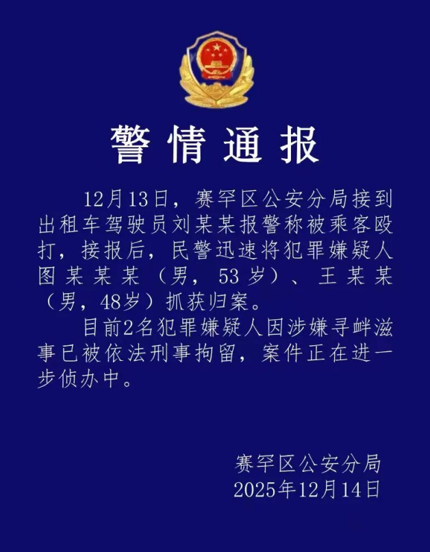 ·两男子出租车内殴打司机,呼和浩特市警方通报:涉寻衅滋事,已刑拘。