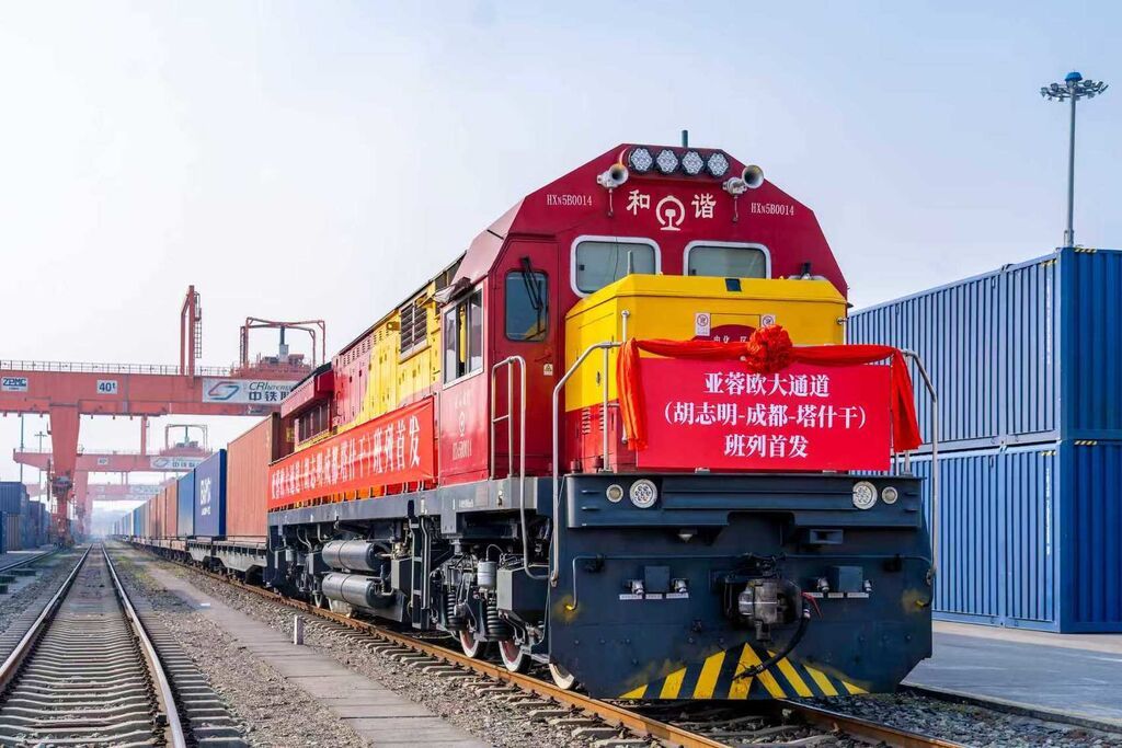 12月16日,成都国际铁路港,亚蓉欧大通道(胡志明—成都—塔什干)班列首发。这趟班列运载越南牙刷等百货,此前从越南胡志明发出,抵达成都国际铁路港完成编组后,将一路向西驰骋,预计12天后抵达位于中亚的乌兹别克斯坦塔什干。