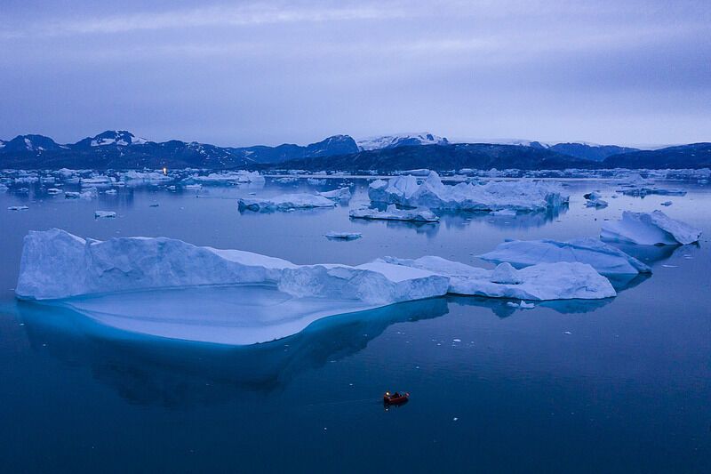 △当地时间2019年8月15日,格陵兰东部,一艘船在夜晚航行在巨大的冰山旁边。