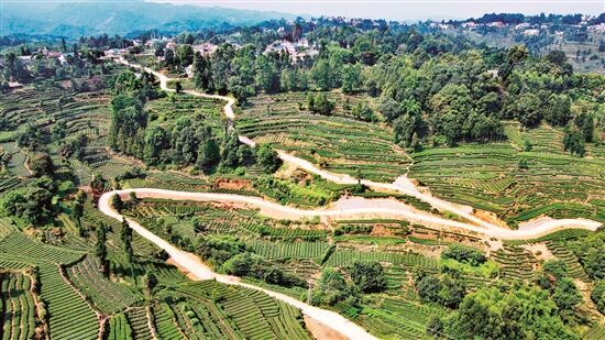阳坪村,一片丘陵与平坝交织的土地。过去,这里虽拥有茶叶、果蔬等资源,却因道路狭窄、运输不便,产业难以壮大,集体经济“造血”功能薄弱。如今再度走进阳坪,景象已然不同:坝区良田,蔬菜青翠;丘区山间,新修的4.5米宽产业路如玉带环绕,连接起千亩茶园,生机盎然。