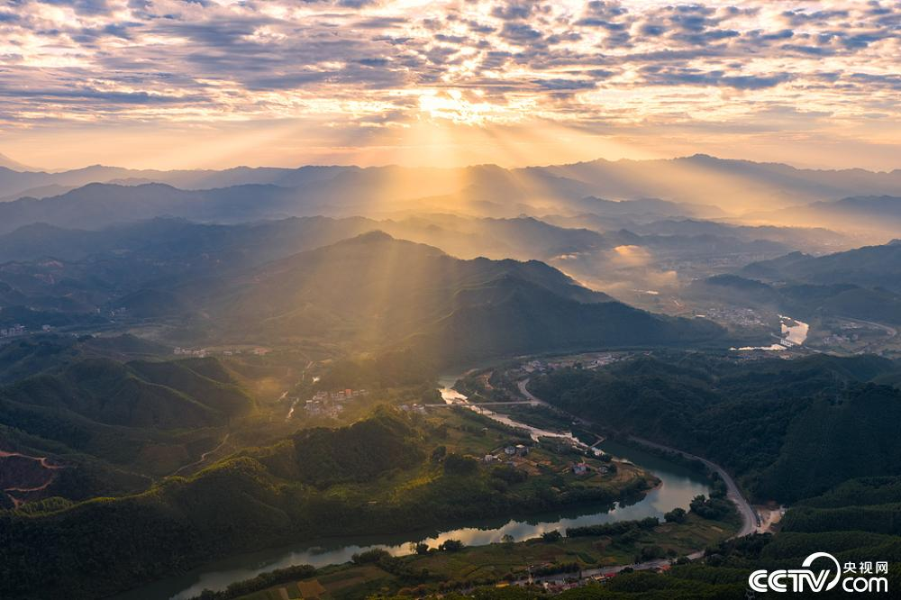 12月17日,广西梧州市蒙山县黄村镇明觉村,无人机视角下的河流、村庄、公路、晨雾、彩霞在阳光的映照下蔚为壮观,一幅生态乡村画卷映入眼帘。
