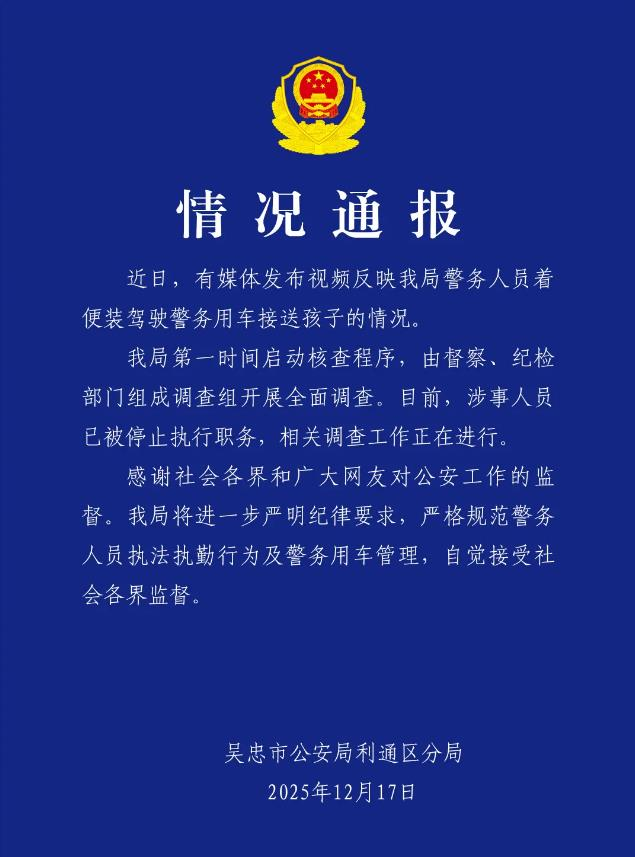 ·警方通报“警务人员开警车接送孩子”:涉事人员已被停止执行职务。
