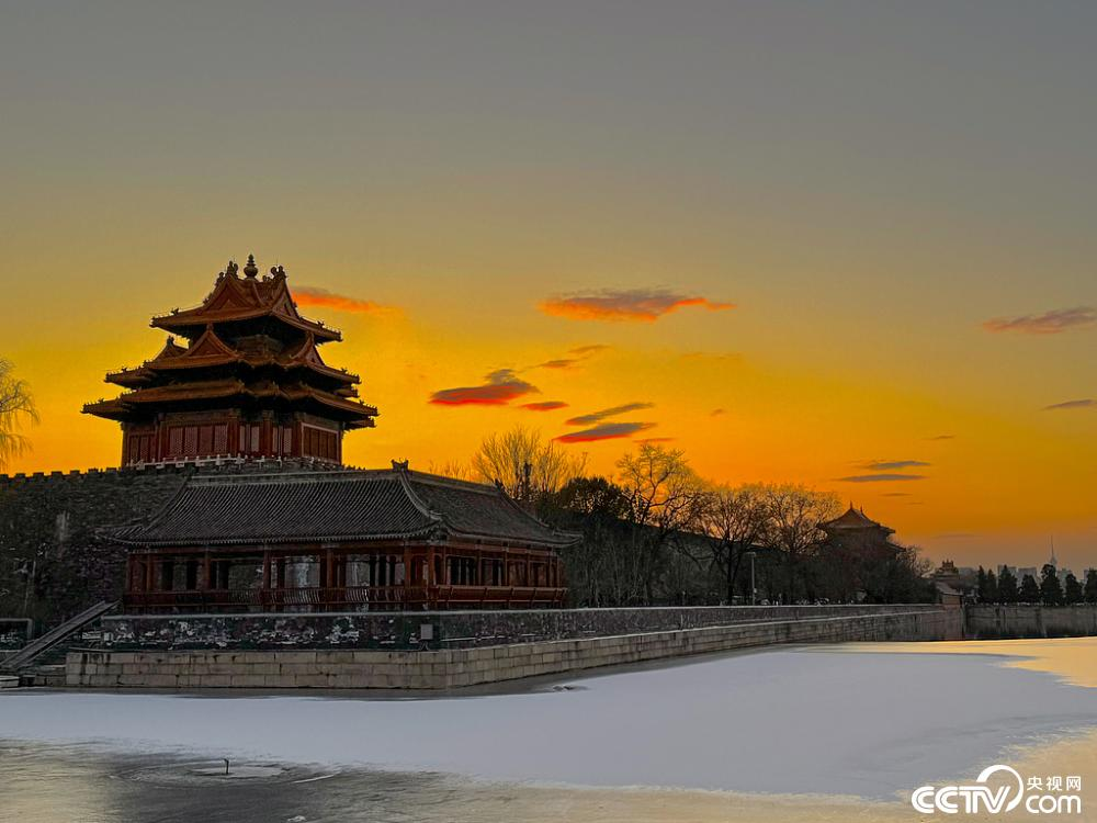 12月16日傍晚,刚经历过降雪的北京碧空如洗,故宫角楼的琉璃瓦覆盖着薄雪,在暖橙与绯红交织的晚霞中熠熠生辉。