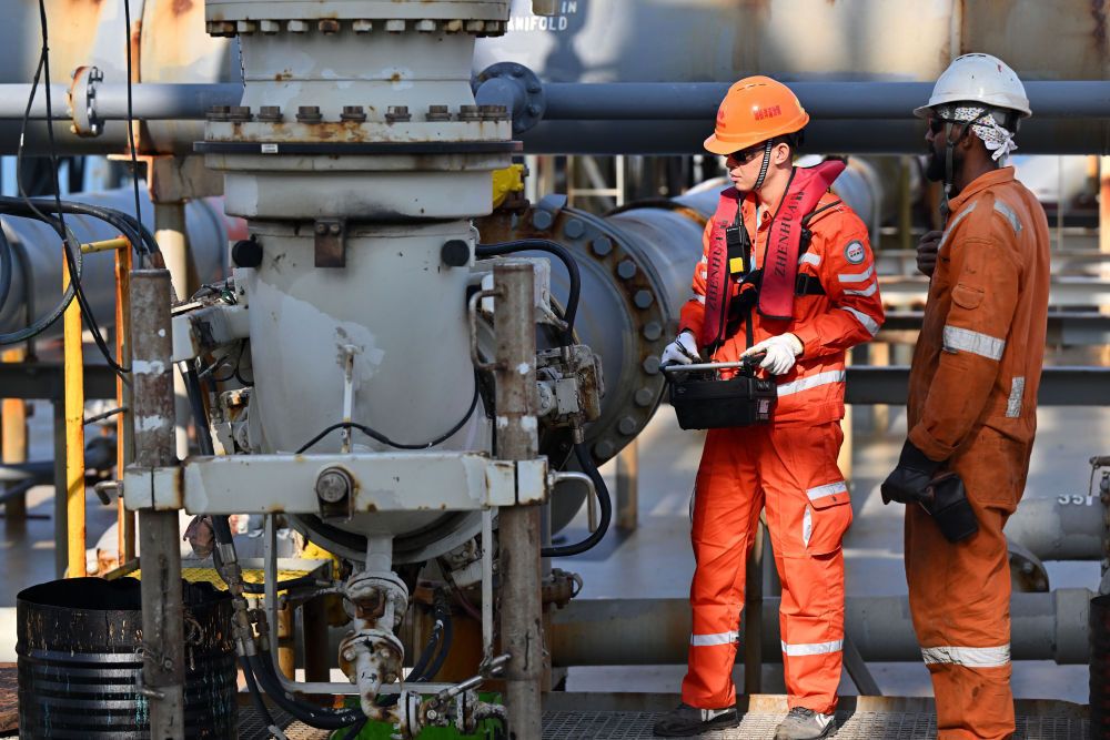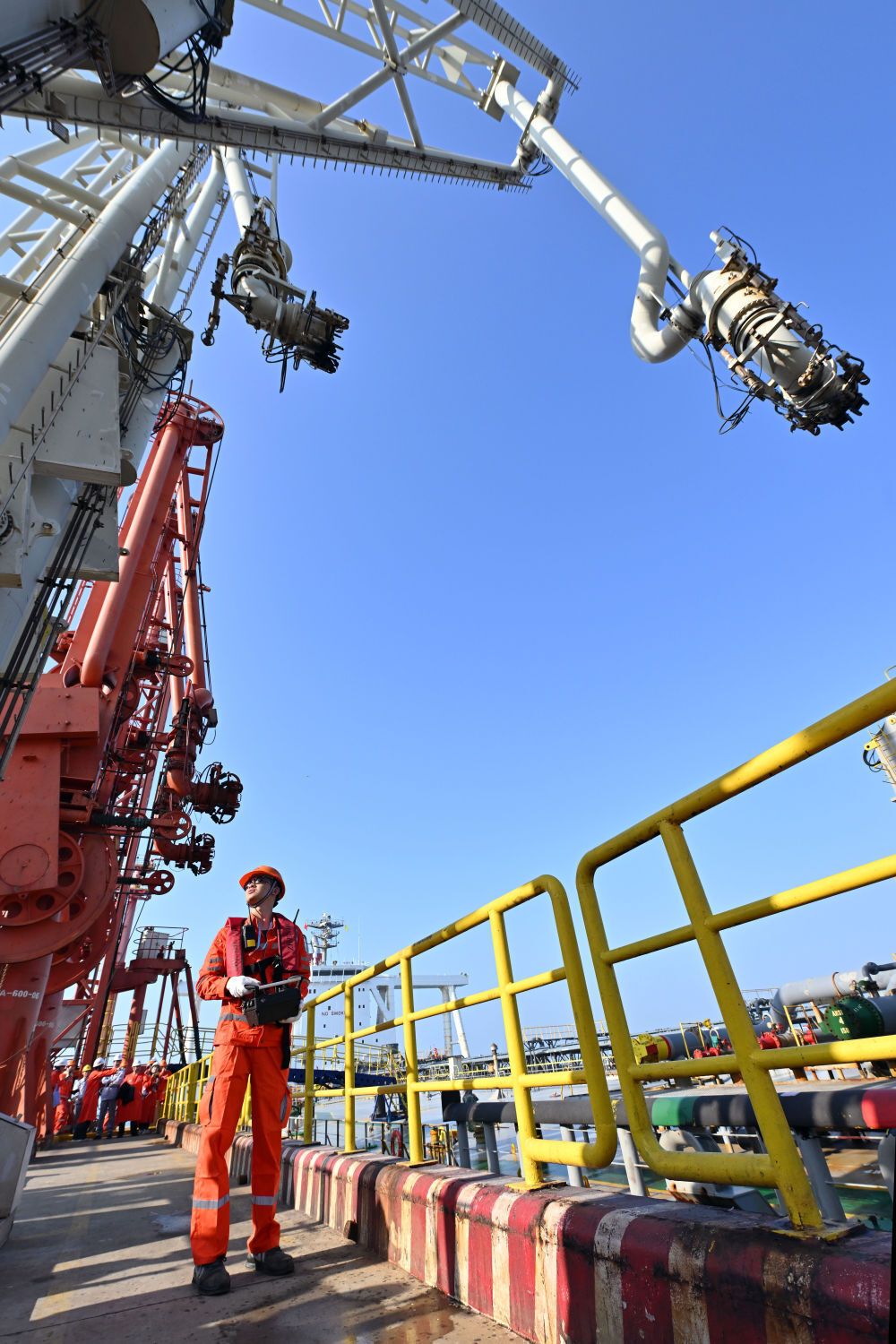 ↑ 12月18日,装载着石化原辅料的船舶抵达洋浦港后,国投洋浦油储码头工作人员(左)和船舶外籍船员在进行卸油作业。