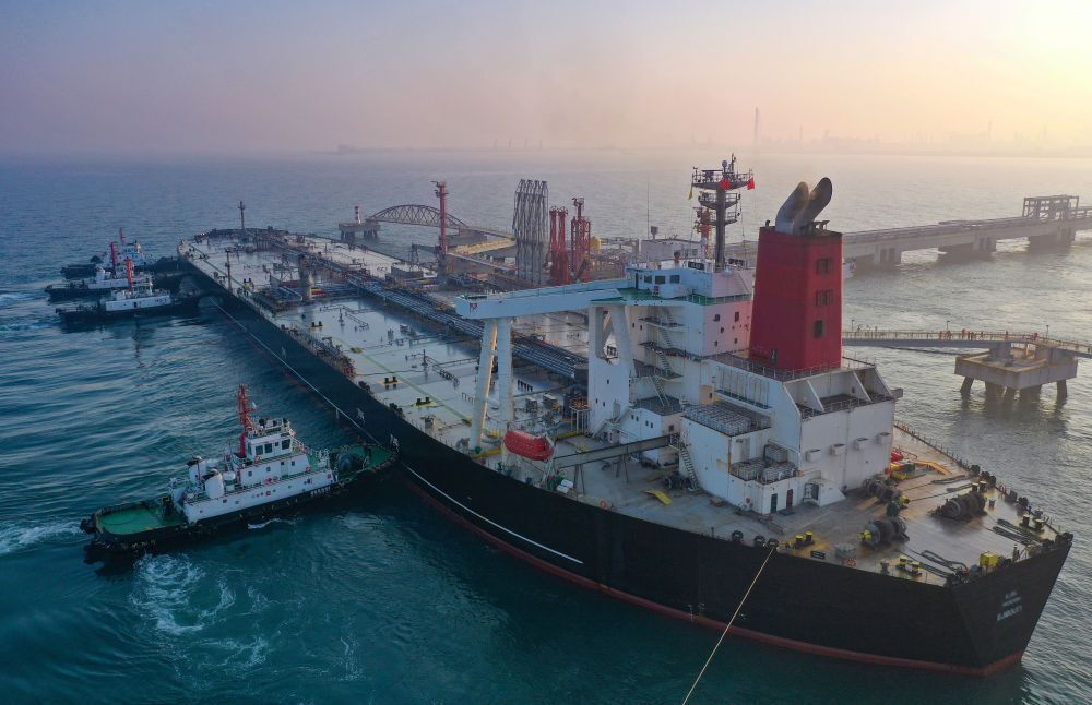 ↑ 12月18日,一艘装载着17.9万吨石化原辅料的船舶泊入国投洋浦油储码头30万吨级原油泊位(无人机照片)。