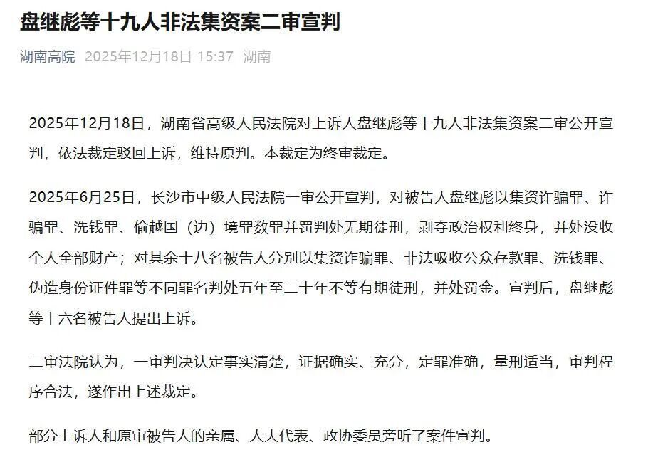 ·长沙盛大金禧非法集资案二审维持原判:涉案资金911亿,主犯盘继彪获判无期。