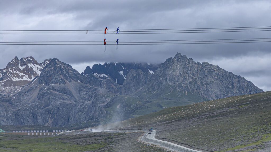 在甘孜州色炯玛山,金上—湖北特高压工程海拔最高塔开展放线工作。