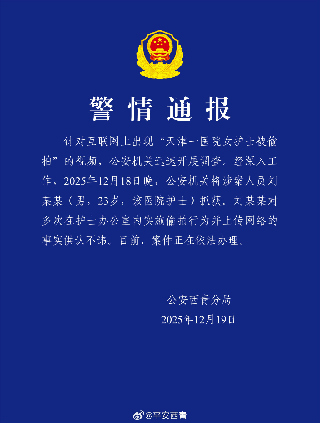 ·天津通报医院护士更衣室被装摄像头:23岁男护士多次偷拍,已被抓。