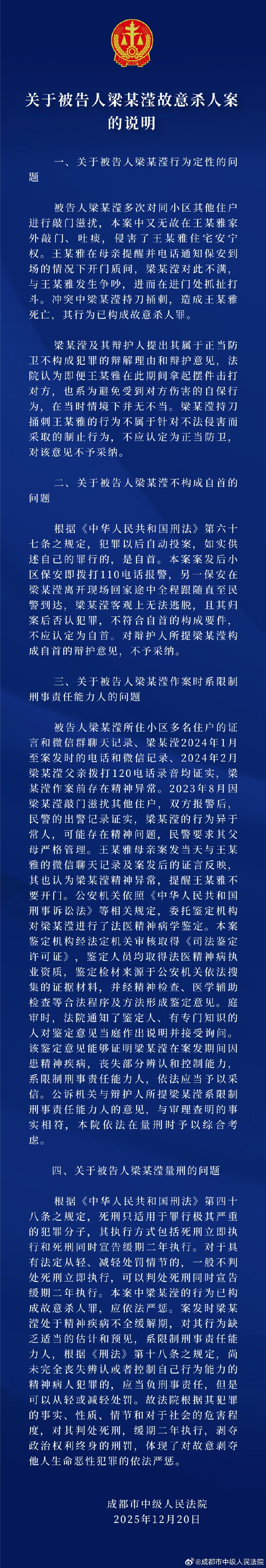 2025年12月20日,四川省成都市中级人民法院一审公开宣判被告人梁某滢故意杀人一案,对被告人梁某滢以故意杀人罪判处死刑,缓期二年执行,剥夺政治权利终身。