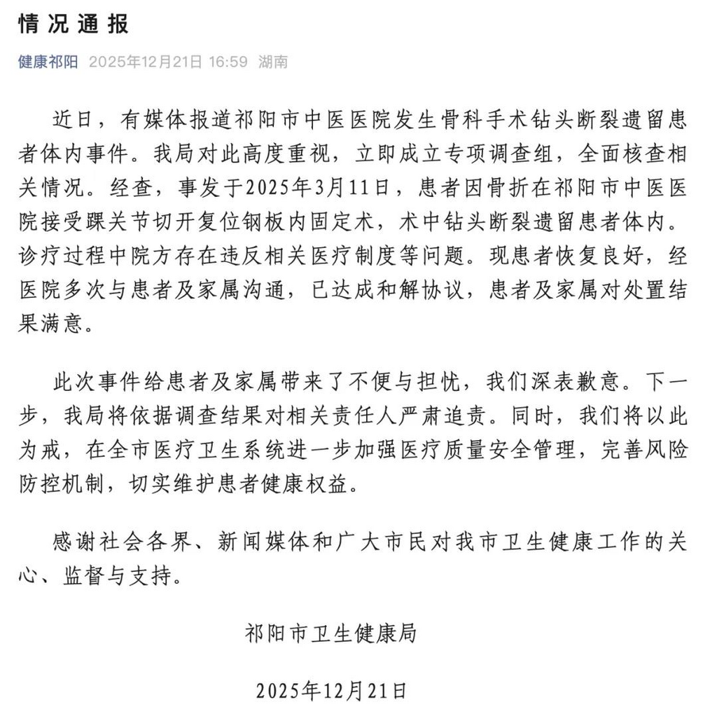 ·湖南祁阳通报“手术钻头断裂遗留患者体内”:对相关责任人严肃追责。