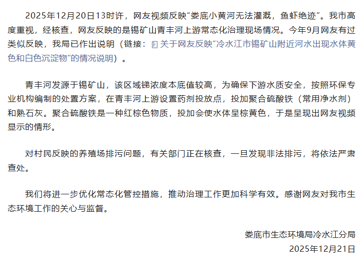 ·网友反映“冷水江锡矿山青丰河水体呈黄色”,官方再次回应。