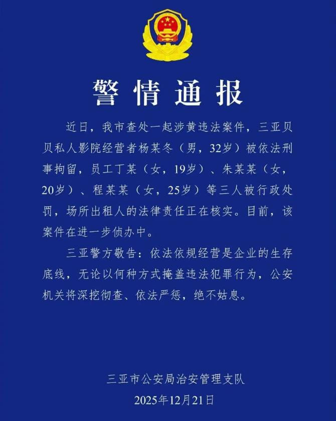 ·三亚一私人影院涉黄,警方通报。