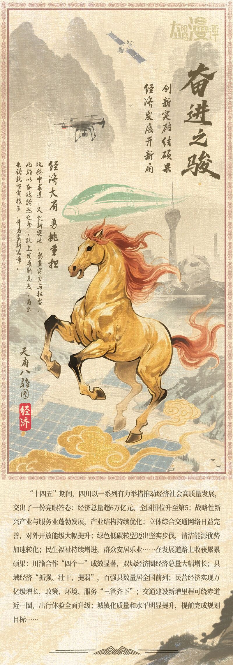 “十四五”期间,四川以一系列有力举措推动经济社会高质量发展,交出了一份亮眼答卷:经济总量超6万亿元、全国排位升至第5;战略性新兴产业与服务业蓬勃发展,产业结构持续优化;立体综合交通网络日益完善,对外开放能级大幅提升;绿色低碳转型迈出坚实步伐,清洁能源优势加速转化;民生福祉持续增进,群众安居乐业……在发展道路上收获累累硕果:川渝合作“四个一”成效显著,双城经济圈经济总量大幅增长;县域经济“抓强、壮干、提弱”,百强县数量居全国前列;民营经济实现万亿级增长,政策、环境、服务“三管齐下”;交通建设新增里程可绕赤道近一圈,出行体验全面升级;城镇化质量和水平明显提升,提前完成规划目标……