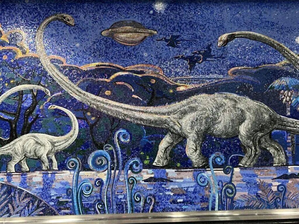 理工大学站得名于高校“成都理工大学”,从扶梯上来时便会被这一墙的流光溢彩给吸引,以成都理工大学自然博物馆中珍贵的合川马门溪龙为灵感,用120万粒马赛克拼接而成的幽蓝色的巨幅壁画,“穿越”回远古世纪,一站一景随手一拍都是大片。