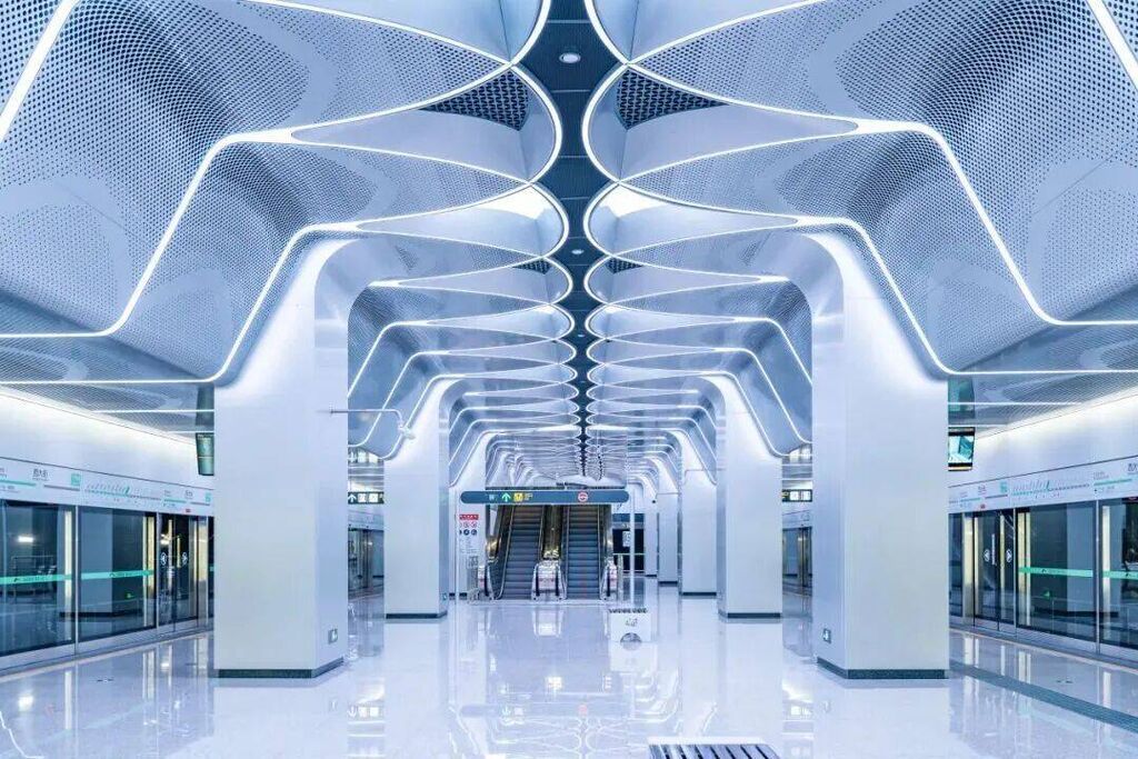 珠江路站围绕“穿越之门”的设计理念,利用张力十足的线条灯光,巧妙划分空间层次,远远看去两侧灯箱仿佛巨大的“时空之眼”踏上未来之旅。