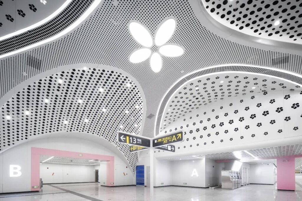 站如其名,幸福梅林站整体空间以梅花为主要元素,梅花灯饰与粉白光影置身其中,沉浸式“游梦梅庭”浪漫,满分梅花元素无所不在。