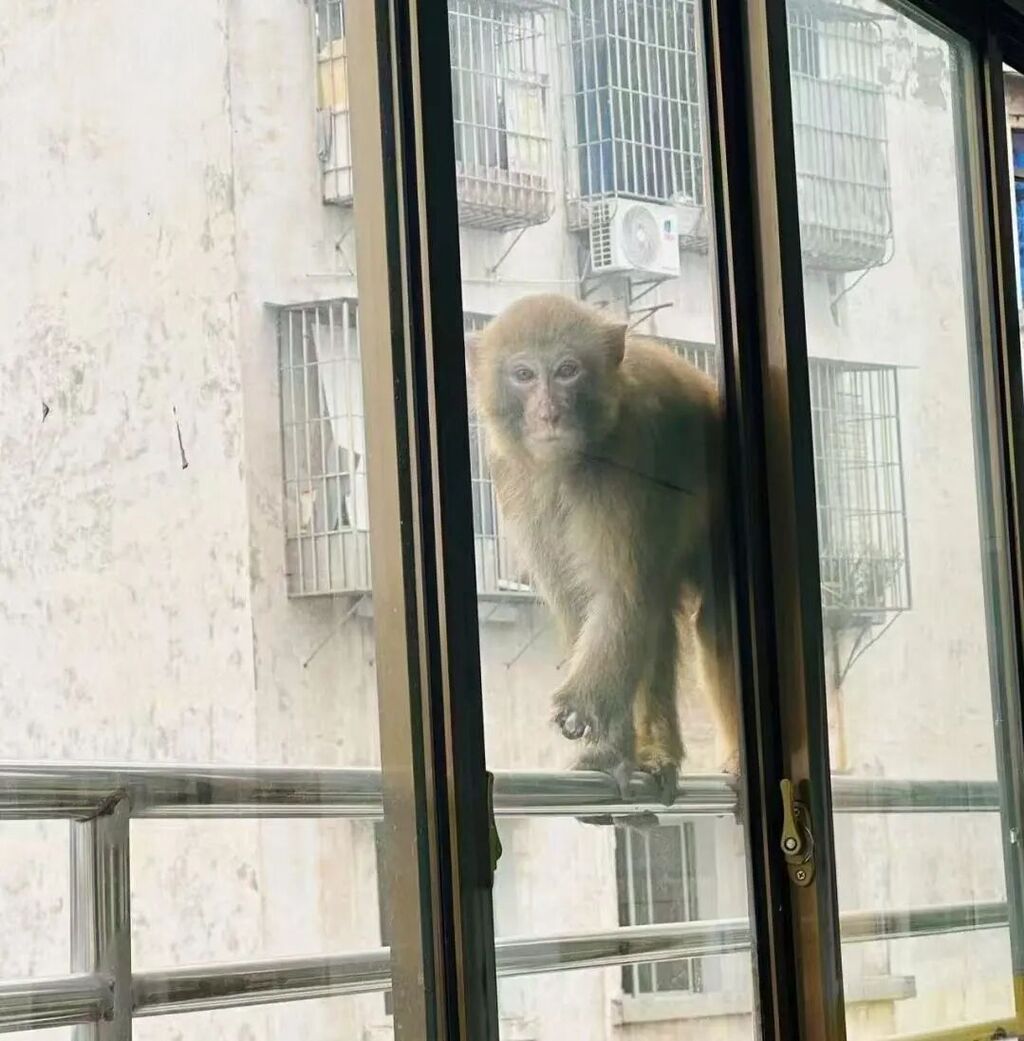 不止豹猫爱串门,猴子更厉害,直接闯进了合江一所幼儿园,在窗外的防护栏上“溜达”。